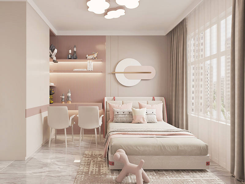 当然作为孩子长时间居住的房间,儿童房在装修时还要考虑到童趣设计。建议采用航天、建筑等主题的卡通元素装饰墙面,并搭配手办、毛绒玩具等卡通软饰,彰显空间的童趣氛围。