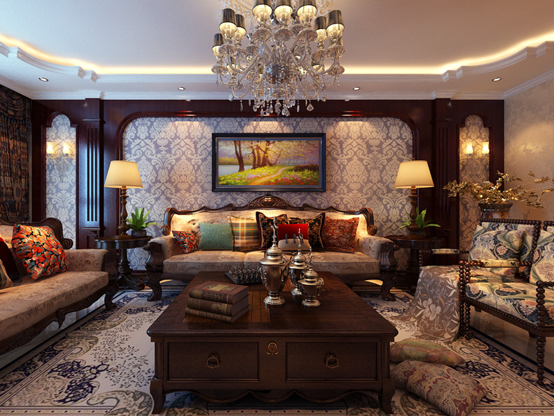 传统欧式对于花蔓纹理运用的较多,繁复花纹的壁纸与吊顶,精致而浪漫的搭配融合出优雅品位。沙发背景墙整体设计以对称美学进行装点,流畅的线条勾勒出家居氛围。