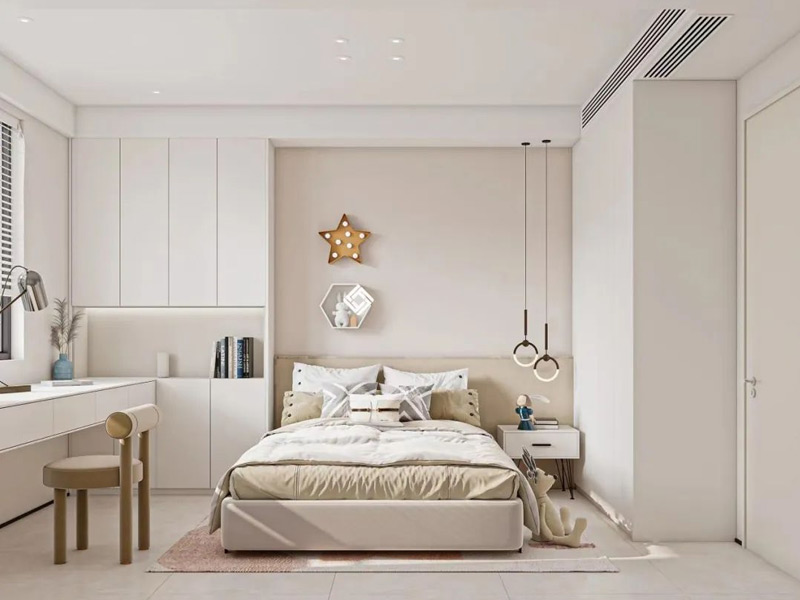 每种装修风格都有其常用的颜色,比如奶油风常用奶白色、奶茶色等颜色,卧室的颜色也不应该脱离主体颜色,这样看起来会更统一。