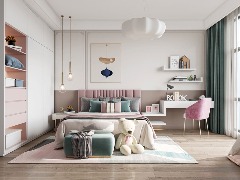 儿童房采用粉色调设计清新活力,更符合小孩子的喜好,避免压抑,定制书桌使视觉更饱满和谐。