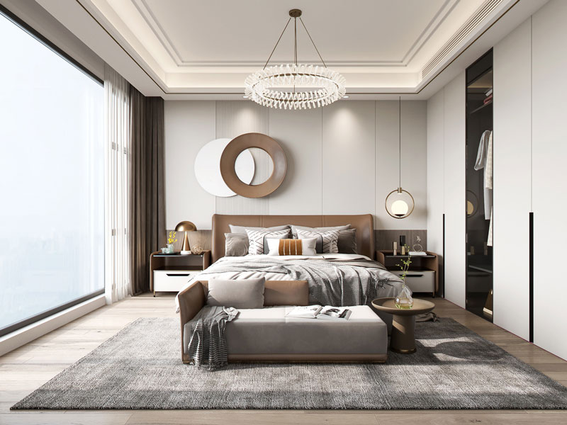 卧室整面落地窗设计,视野更开阔大气,增进空整体采光,拼接设计背景墙赋予区域层次感,避免单调。