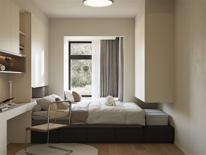 聚焦实用精致,浅墙基础+深色床头,构建层次氛围。增设书桌、悬浮灯,兼容休憩与办公;深浅撞色床品、编织盖毯,传递自然温度。无主灯搭配线性光,勾勒睡眠区松弛感,打造适配现代高效生活。