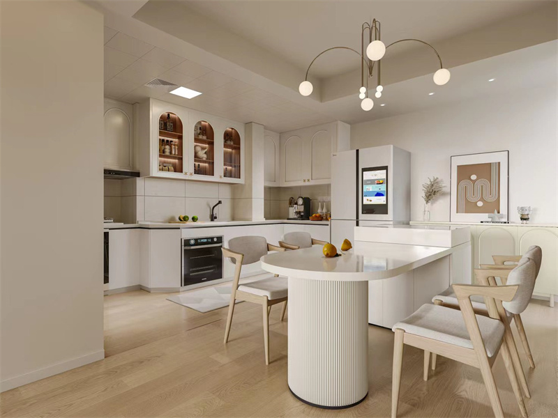 以简洁的白色为主,搭配浅木色的家具,营造出干净明亮的用餐与烹饪环境。独特造型的吊灯为空间增添了设计感,充足的橱柜收纳与中岛台的设计,又为用餐提供了便利。