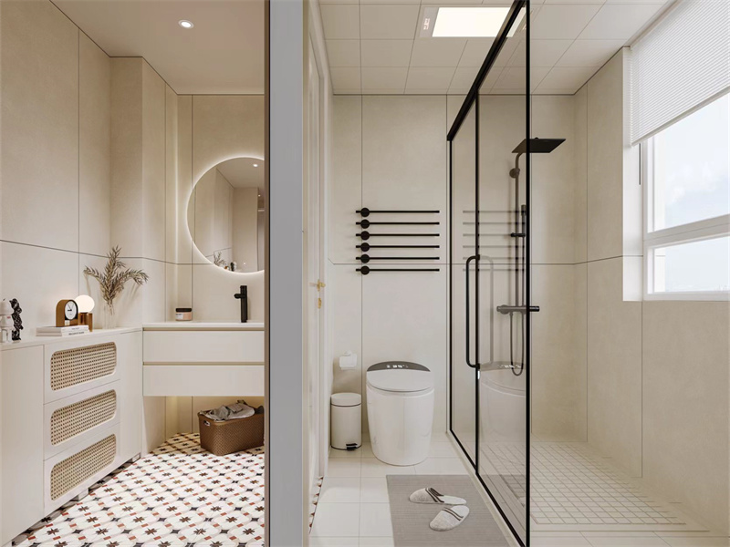 延续了奶油系的柔和色调,搭配带有花纹的地面瓷砖,增添了一丝活泼气息。圆形镜子、智能马桶与玻璃淋浴房的设计,既方便日常使用,又提升了空间的现代感与实用性。