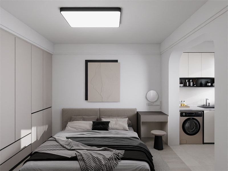 一体化衣柜实现收纳与空间融合,床头艺术画平衡简约与艺术氛围,床品通过黑灰格纹、纯色碰撞丰富层次。让空间在简洁中传递出舒适与质感。
