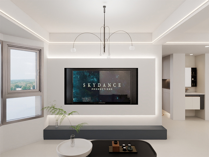 线性灯与吊灯结合,塑造多层次照明。悬浮电视墙借灯光强化立体感,弧形吊灯增添灵动,黑白灰配色简洁大气。大窗引入自然光线,绿植点缀生机,打造出兼具现代感与通透感的环境。