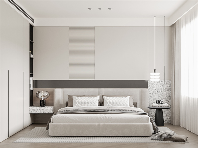 床头背景墙的线条设计增添层次感,悬浮床头柜与独特造型的吊灯搭配,尽显雅致,充足的自然光线引入,让空间更显温馨放松,打造出惬意的休憩环境。