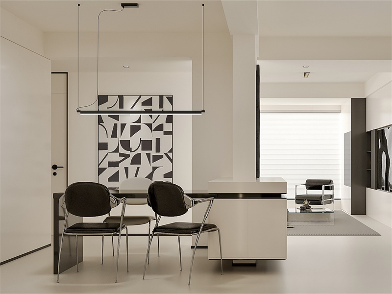 区域采用简约的色彩搭配,长形吊灯线条感十足,为空间增添设计感。几何艺术画丰富视觉层次,黑白配色的座椅与柜体相呼应,开放式布局让空间更显通透。