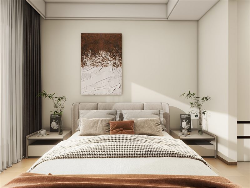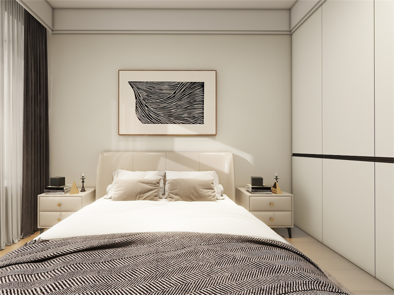 米白床具与黑白床品形成对比,对称床头柜提升规整感。嵌入式大衣柜增强收纳功能,黑白艺术画点缀墙面,深灰窗帘与木质地板柔化空间,整体在简洁线条与材质,实现简约与舒适的平衡。