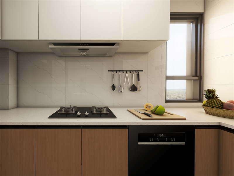 白色柜体与木色地柜形成层次,大理石墙砖提升质感。功能布局上操作区与收纳区清晰,厨具挂架增强实用性,色彩的协调中,呈现出简洁高效。
