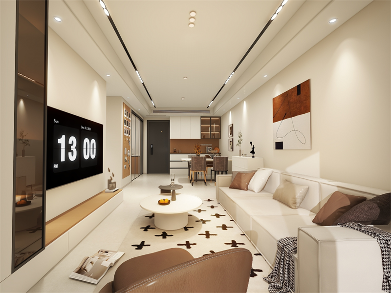 十字纹地毯与圆形茶几形成视觉焦点。嵌入式电视墙与线性灯增强空间层次,艺术画与软装摆件提升格调,开放式布局让餐厨与客厅动线流畅便捷。